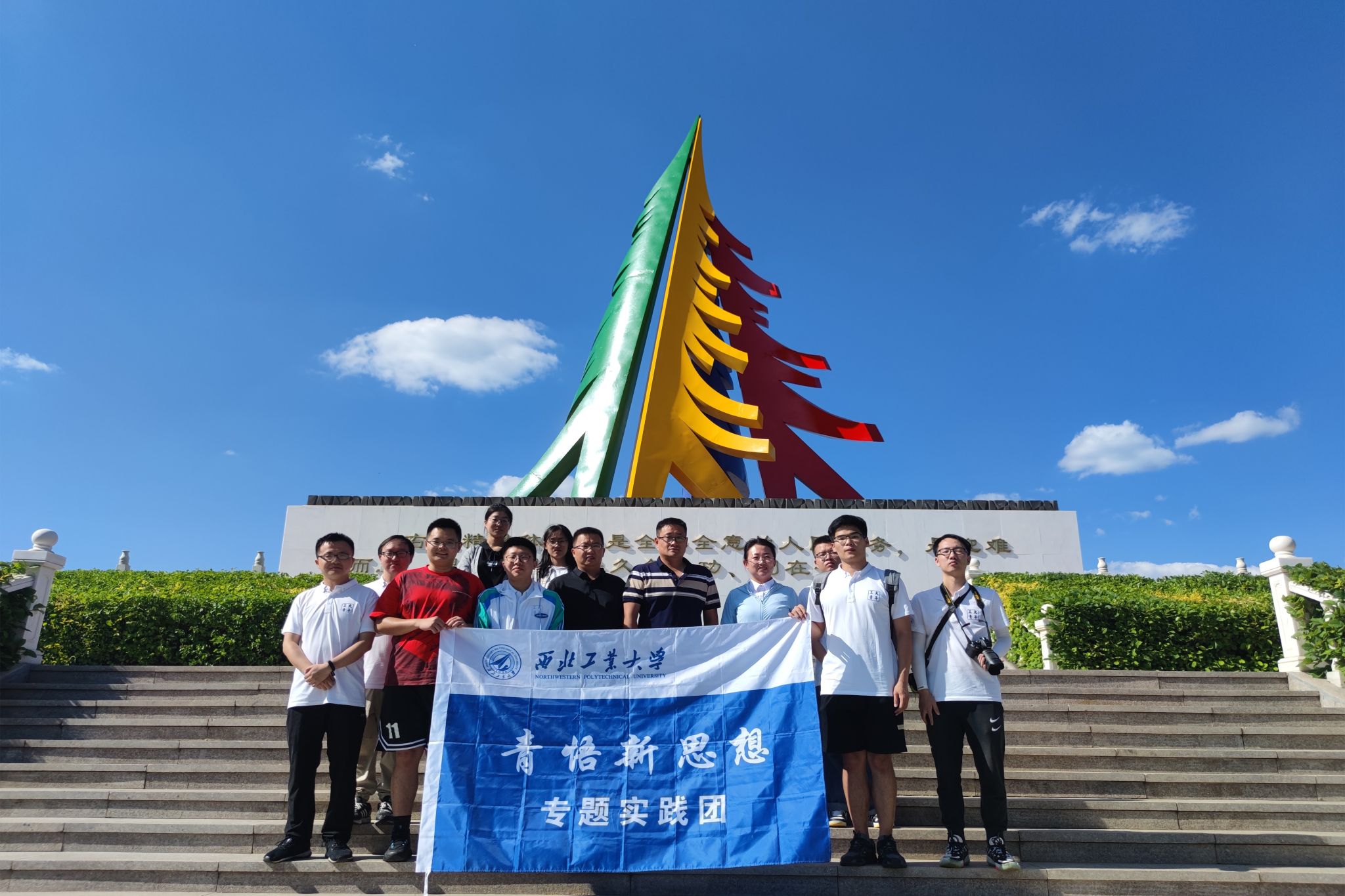 图为实践队赴南山森林公园与绿化丰碑合影