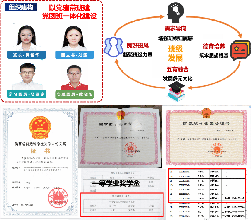 班级建设:22102-1班由23名博士生组成,其中男生19名,女生4名,党员人数16名,占总人数的69.57%。班级始终遵循“以培养‘总师型’人才为目标”的班级理念,倡导以党建带班建,党团班一体化建设,注重组织建构,适时调整班干架构。发挥班长在集体建设中先锋作用,增强班级归属感,同时发挥团支书引领作用,筑牢思想根基,并以特色活动为抓手,发展多元文化,最终成为一个有凝聚力的班集体。在过去一年里,他们硕果累累。班级课程加权平均分,89.35分,位于年级第一;综合测评也位于年级第一,国家奖学金3人次、tyc122cc太阳成集团一等学业奖学金13人次、省级优秀员工干部1人次,陕西省自然科学优秀学术论文奖1人次。