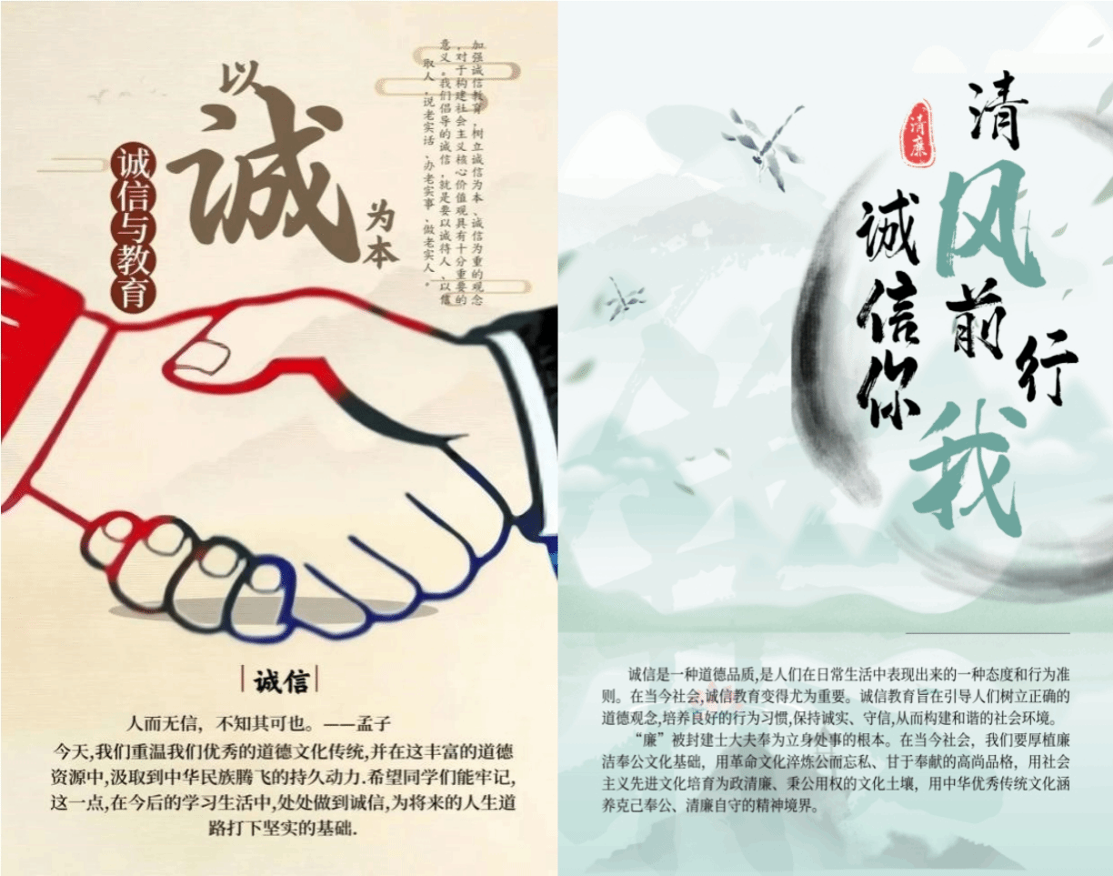 在校园里,我们不仅要追求学业的成功,更要注重品德的培养。诚信与廉洁是我们学习与成长的底色,也是我们走向社会的底气。愿我们每一个老员工都能在日常生活中做到廉洁诚信,成为社会的脊梁,为廉洁文化添砖加瓦,让诚信之光和廉洁之美在校园中闪耀,照亮我们前行的道路。