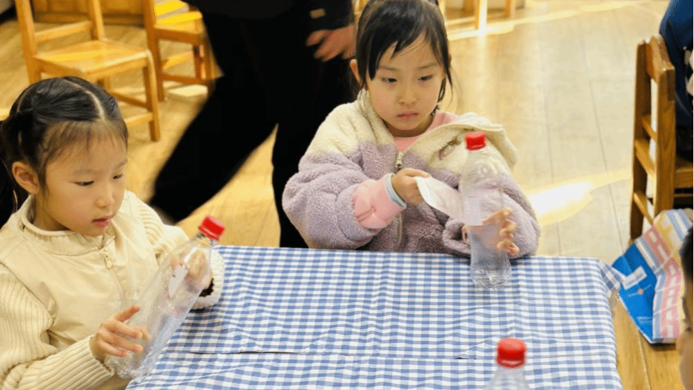 随后,志愿者马世博带领小朋友们进入了动手实践环节——《单级水火箭制作》。在家长的协助下,小朋友们纷纷拿出事先准备好的材料,开始动手制作属于自己的水火箭。马世博志愿者一边演示制作步骤,一边耐心讲解,其他志愿者们则在一旁为孩子们答疑解惑。四位家长志愿者也积极参与其中,与孩子们共同完成了水火箭的制作。