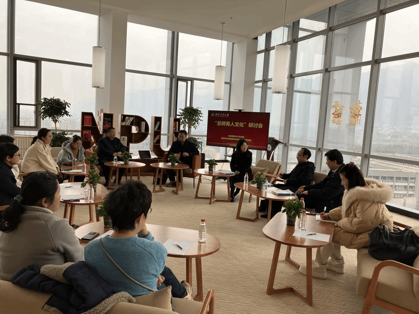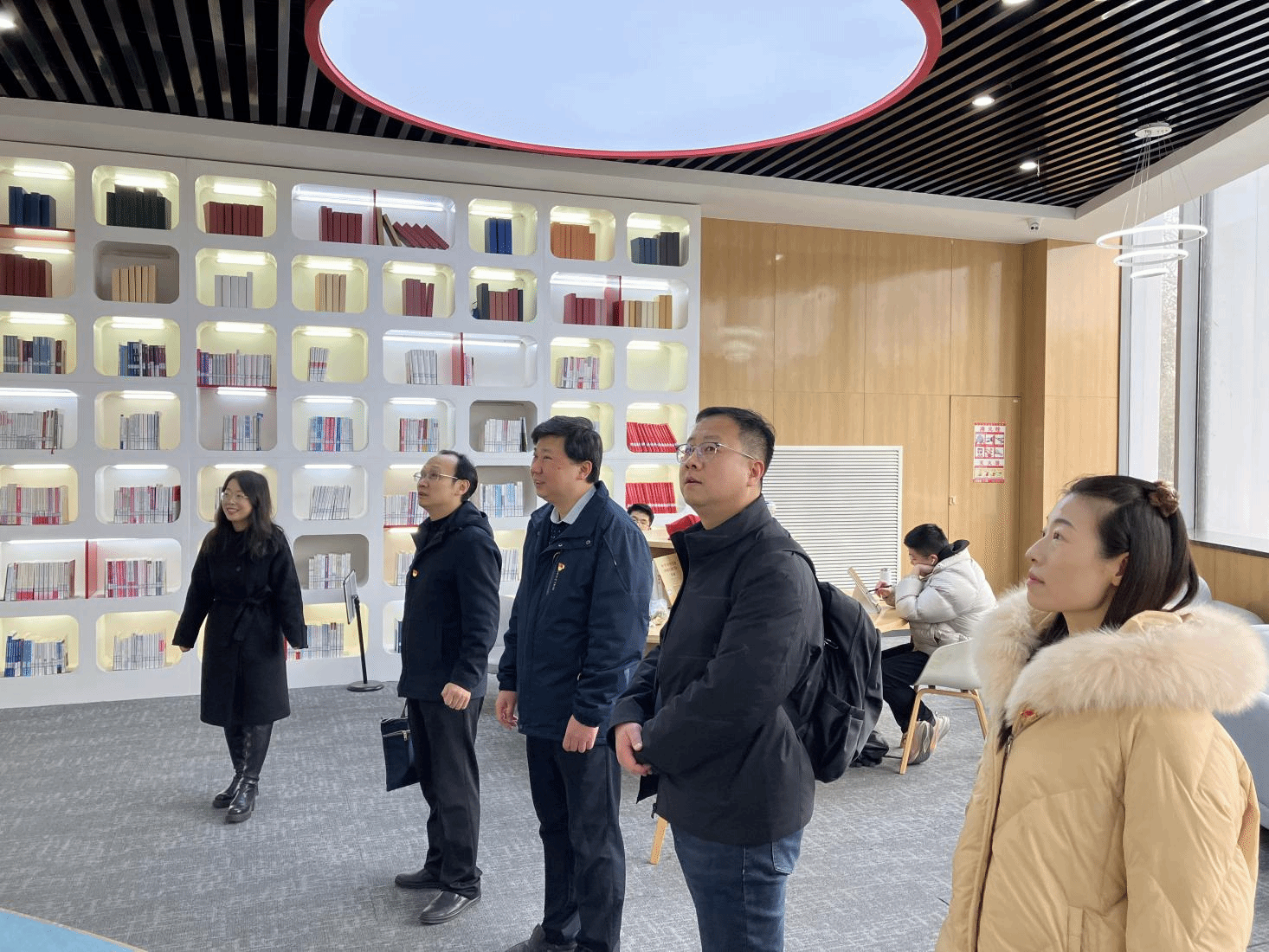 随后,大家来到了九楼“云上书阁”,其作为综合研讨、休闲探讨的多功能活动区域,是长安校区图书馆的又一特色区域。在这里,双方支部党员们围绕“总师育人文化”展开研讨。精导所所长郭建国教授介绍了公司和研究所在“总师育人文化”的贯彻过程中,从“多学科、多元化”的教育方法,“工科、理科、文科”互相结合的教育模式等方面开展的工作。支部书记卢晓东对公司图书馆日新月异的发展和进步表达了赞叹,同时通过整理书架的学雷锋义务活动体会到了图书馆全体教师们工作的辛苦和重要性,希望双方支部通过党建与业务交流活动为师生办实事,推动“总师育人文化”的走深走实。