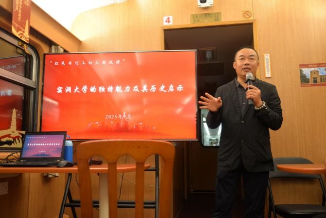 列车上,陕西省委团队库副教授刘金峰老师为大家带来了一堂生动的大思政课《窑洞大学的独特魅力及其历史启示》。刘老师从红歌说起,以陕西方言引入,为同学们讲解红军大学的起源与建立,搬迁与发展。在这个边走边学的流动课堂里,昔日遥远的历史知识化作了精神的洗礼。
