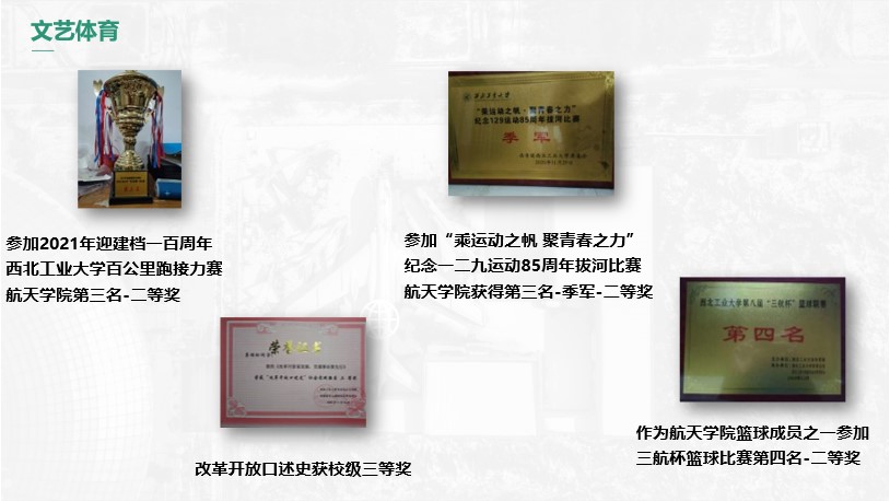 所获荣誉:学分积排名18/262,综合测评排名20/262。社会服务方面,曾担任班级文体委员,组织班级在大类的小班篮球赛中获得第四名的成绩;参与图书馆志愿服务,获得优秀志愿者称号,志愿时长累计78小时。文艺体育方面,作为成员参加2021年建党一百周年百公里接力跑,公司获得第三名;参加“乘运动之帆 聚青春之力”纪念一二九运动85周年拔河比赛,公司获得第三名;参加三航杯篮球比赛,公司获得第四名。校园活动方面,曾获“四史”答题竞赛一等奖、火箭放飞大赛二等奖、党史竞赛二等奖、“鸡蛋撞地球”二等奖等。学科竞赛方面,获得全国老员工数学竞赛一等奖、“互联网+”校赛三等奖等。
