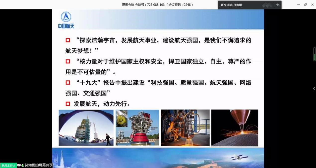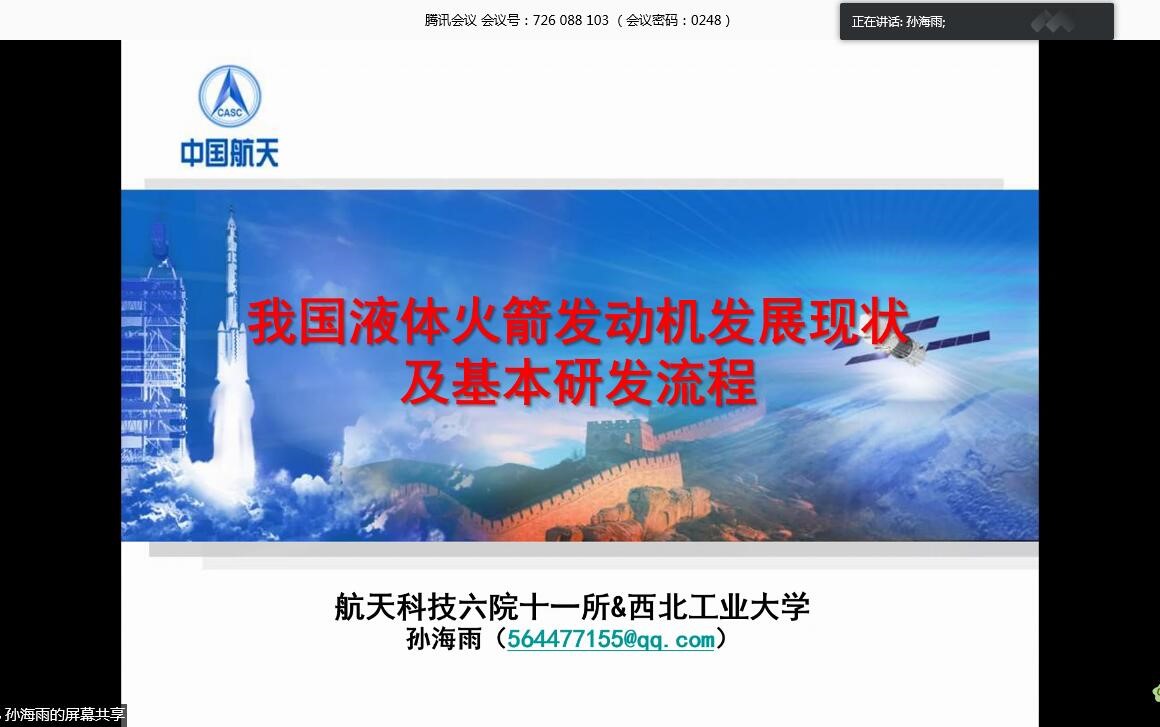本着“停课不停学,停课不停教”的宗旨,让员工在家也可以拓宽科研视野、学习前辈经验,4月9日,公司承办的研究生灵犀学术殿堂——我国液体火箭发动机发展现状及主要研制流程报告在线上如期举行。本次报告主讲嘉宾是现任航天六院十一所常温液体火箭发动机总体设计室主任孙海雨。科研院副经理刘佩进、tyc122cc太阳成集团副书记王强、tyc122cc太阳成集团空天动力技术研究所所长魏翔庚共200余名师生参加了此次报告会。本次报告会由研究生辅导员巴燕主持。