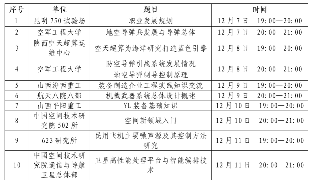 知识讲座共计10场,12月7日至12月11日每天19:00—21:00时段各安排两场,具体时间安排如下表。讲座采用腾讯会议形式进行,会议号670-4706-3278,请各位同学提前10分钟进入会议室,入会后关闭摄像头及手机麦克风,更改个人用户名(公司-学号-姓名,如“航天/航海-XXXX-张三”)便于各班点名签到。