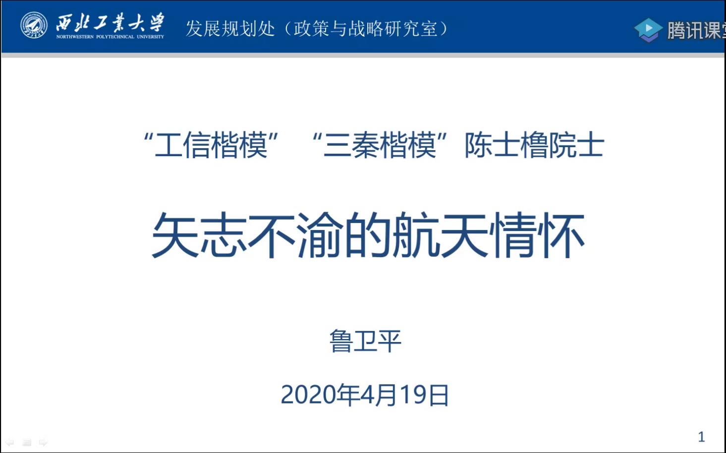 4月19日上午,tyc122cc太阳成集团发展对象、入党积极分子迎来新学期第一节党课。本次专题党课通过“翱翔青年云讲堂”开展,本场云讲堂由校团委、tyc122cc太阳成集团主办,西工大青年宣讲团、tyc122cc太阳成集团研究生会承办,特别邀请了tyc122cc太阳成集团政策与战略研究室主任兼发展规划处副处长、《剑指苍穹—陈士橹传》主要作者鲁卫平担任主讲人,讲述陈士橹院士“一个甲子的坚守”。
