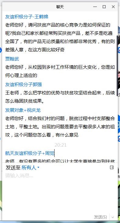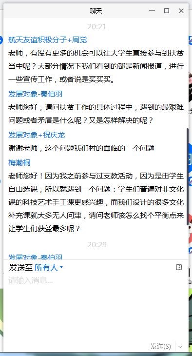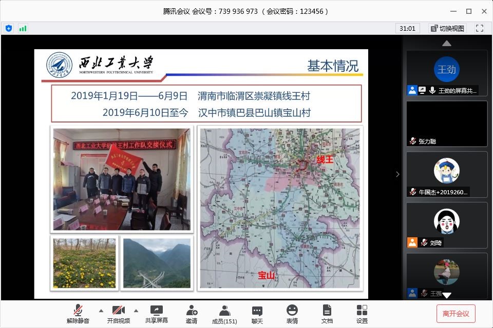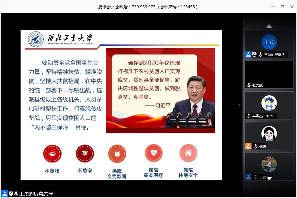 王劲从驻村工作情况、疫情防控措施和青年学子与脱贫三个方面进行了分享与交流。在驻村工作中,王劲因地制宜、因人制宜,不断适应学习,完成了从公司到乡村工作角色的转变。立足于本村实际,制定了“红色教育+国防教育+消费扶贫”的脱贫攻坚发展路线。不仅如此,王劲还有效利用西工大优质科教资源组织开展暑期支教、社会实践等多样化教育帮扶形式,阻断贫困代际传递。在新冠肺炎疫情防控工作中,充分发挥农村基层组织和党员的先锋模范作用,设立检查站严防疫情输入;利用微信、抖音等网络媒介进行防控宣传;落户到人,做好登记等。最后,王劲就“青年学子与扶贫”的话题发表了自己的看法:青年一代是具有创造力和想象力的一代,是打赢脱贫攻坚战的主力军,需要不断地在生产活动和社会实践中励练自己,正所谓“拔节抽穗,培根铸魂正当时”。