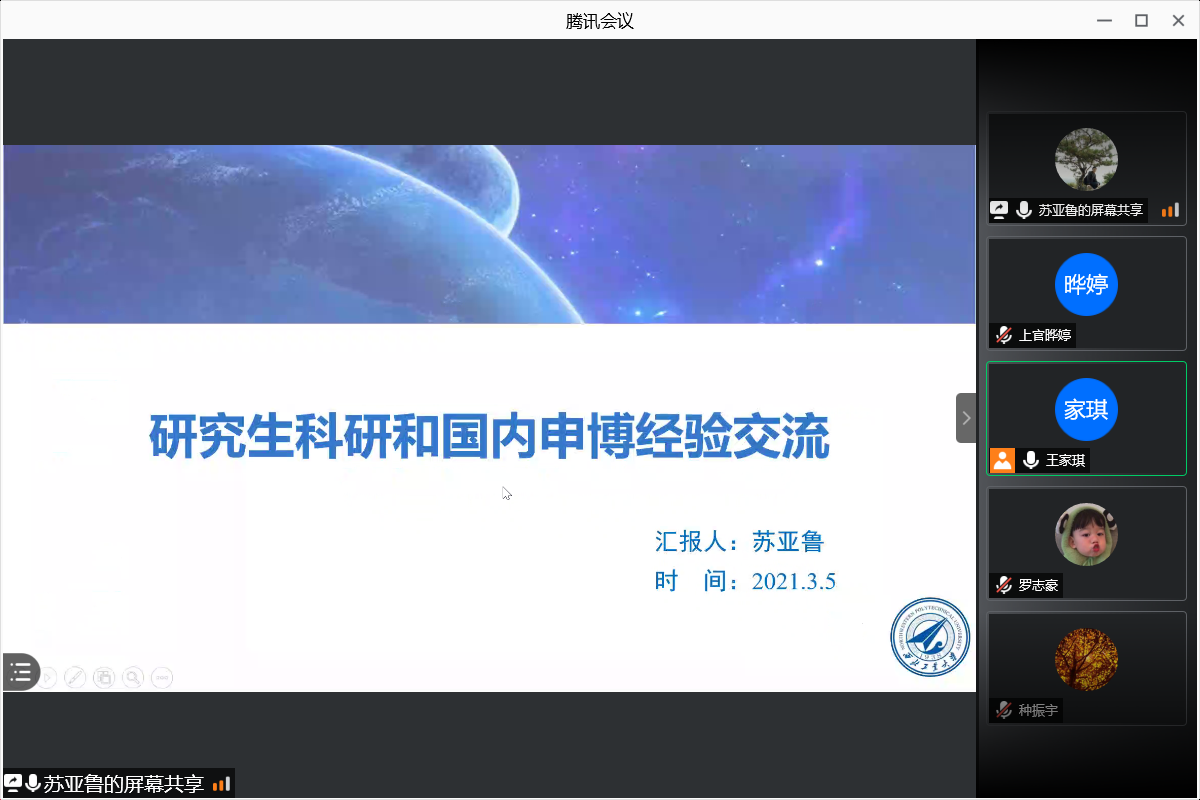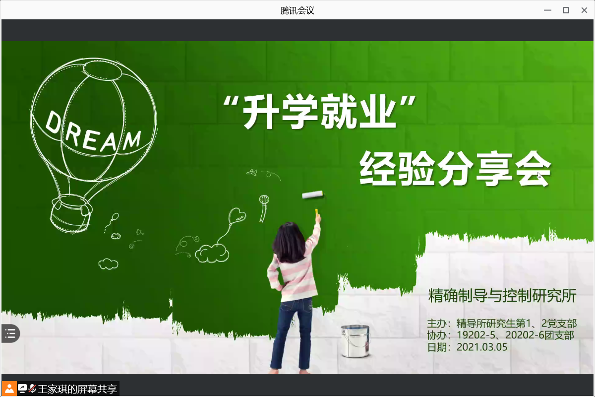 3月5日晚,tyc122cc太阳成集团精确制导与控制研究所在腾讯会议举办以“升学就业”为主题的经验分享会。本次活动由tyc122cc太阳成集团精确制导与控制研究所研究生第一、二党支部主办,19202-5、20202-6团支部协办,精导所学习委员王家琪主持会议,精导所2019级、2020级全体硕士生参加会议。
