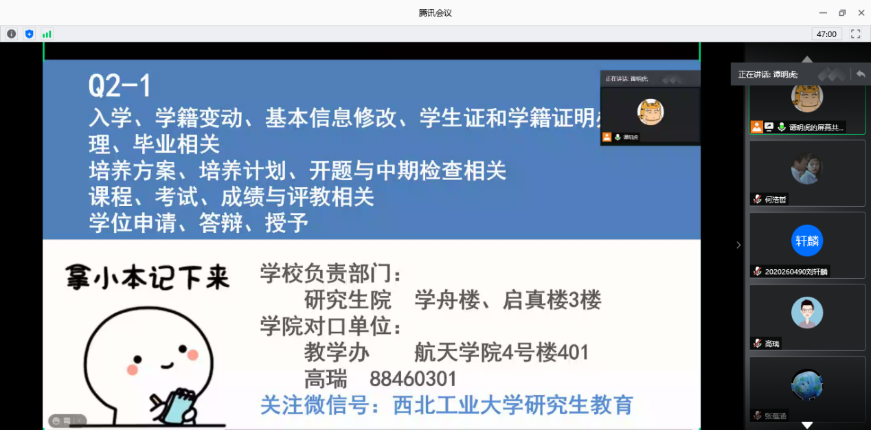 随后,研究生辅导员谭明虎老师为同学们详细介绍了公司办事指南,并分享了研究生生活和注意事项,希望同学们遇到问题及时与公司沟通。研究生教学主管高瑞老师为同学们介绍了培养计划制定和选课流程,并认真回答了同学们提出的相关问题。研究生会主席徐安帮为同学们介绍了公司研究生会的基本情况,展示了航天学子们积极向上的精神风貌与丰富多彩的课余生活,鼓励同学们在努力学习、认真科研的同时,积极加入研究生会,参与研究生会组织的各项活动,共同构建和谐校园文化环境。